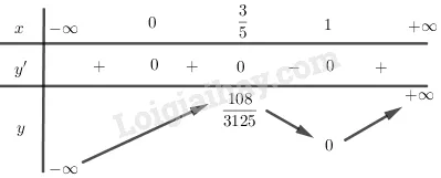 - Tại (x = frac{3}{5}), (y’) đổi dấu từ dương sang âm. Hàm số đạt cực đại tại (x = frac{3}{5}). Giá trị cực đại là (y_{CĐ} = (frac{3}{5})^3 (1 – frac{3}{5})^2 = frac{27}{125} (frac{2}{5})^2 = frac{27}{125} frac{4}{25} = frac{108}{3125}).