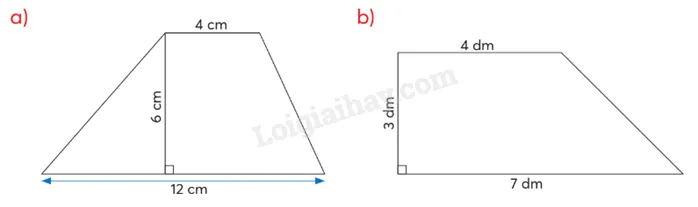 Diện tích = frac{(Đáy lớn + Đáy bé) times Chiều cao}{2}.